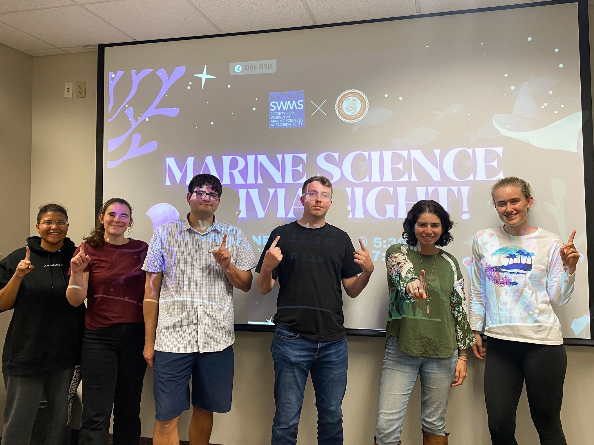 Here at Florida Tech, our chapter of SWMS participated in three rounds of marine science trivia nights as a partnership with the brand “Waterlust”. Waterlust is a clothing brand dedicated to sustainability and ocean conservation, and is made up of both apparel experts and marine scientists. Waterlust sent us three trivia slideshows, each containing twenty-five trivia questions. All of the questions were about marine sciences, and broken down into five subcategories; marine biology, miscellaneous ocean science, ocean physics, marine policy, and questions about the company itself. The questions were projected onto a screen and students attending the event were to write their answers down. After all the questions were asked, we went back through the slideshow and showed the correct answers to the questions. Students were to tally up their answers to determine their total points. Each student on the winning team received a fifty dollar gift certificate to Waterlust. Waterlust keeps a leaderboard each year for each participating institution. Last year Florida Tech placed 7th, and we are still awaiting results for this year.